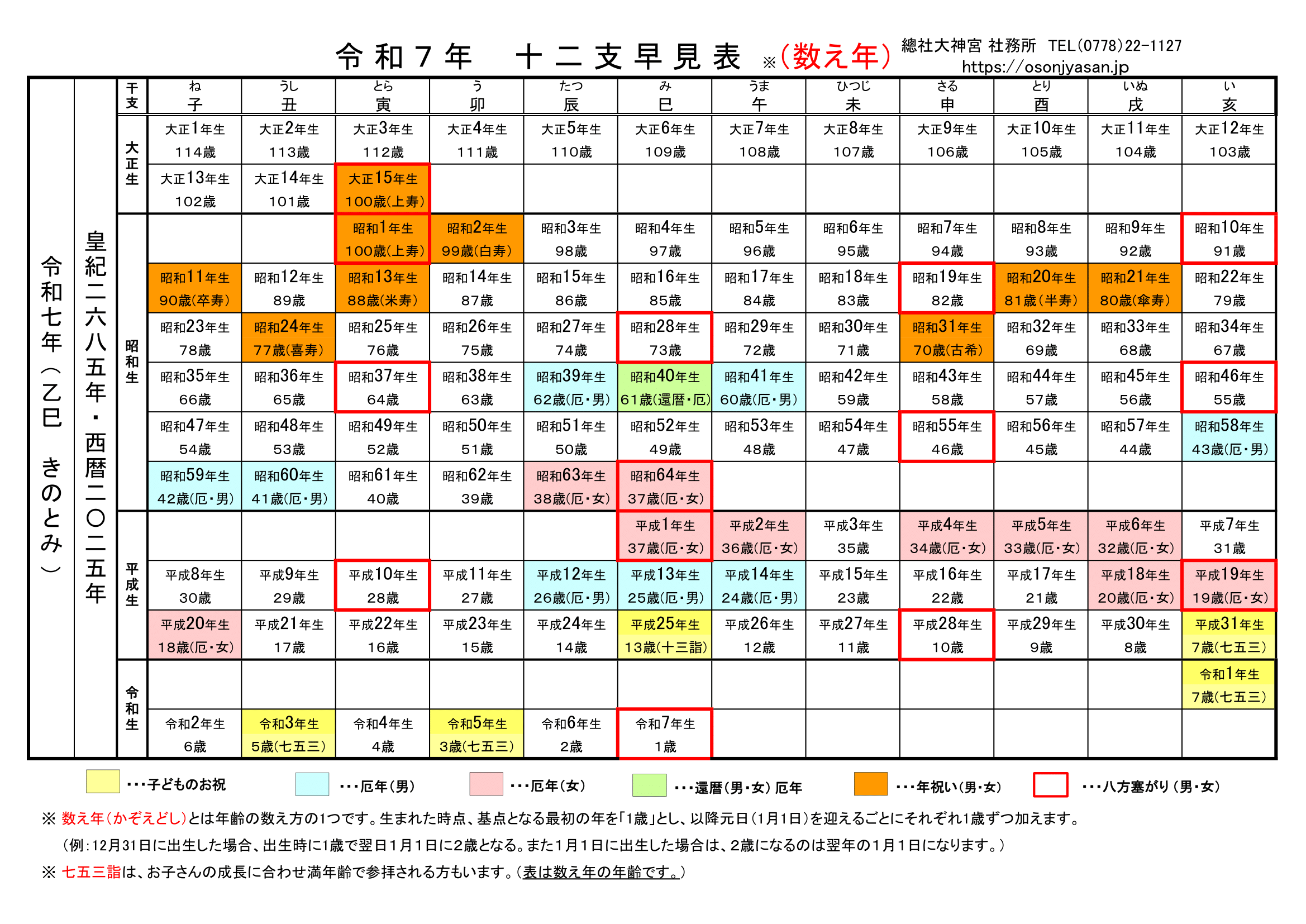 令和7年 十二支早見表(数え年)